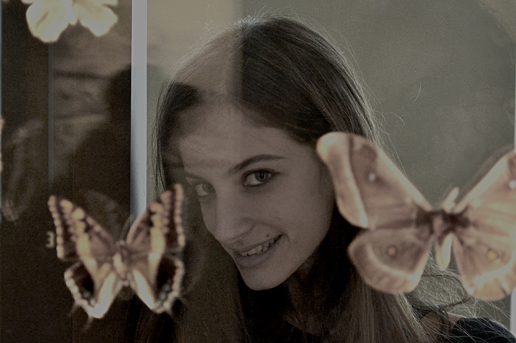 Piacevole l'espressione complice e divertita di Lidia, ...la composizione invece è un pò troppo centrale: avrei ritagliato in modo da rinunciare a metà della grossa farfalla sulla detra così ta tagliare anche sopra e stringere di più sul viso.