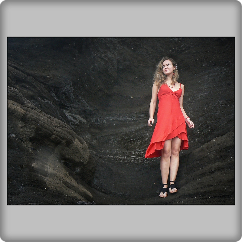 La ricerca era quella del massimo contrasto fra il rosso dell'abito ed il nero della roccia ...