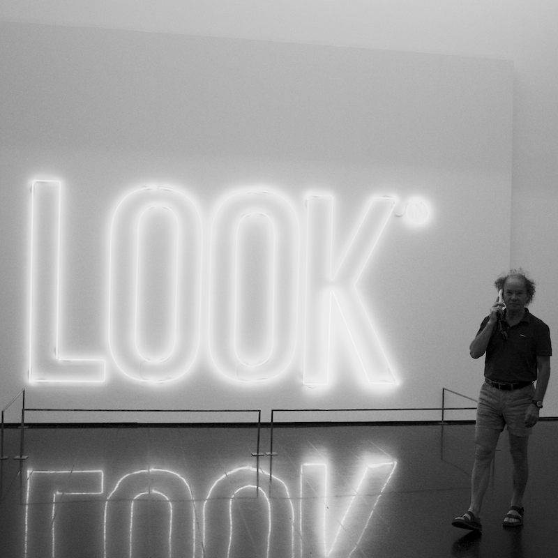 Ci si trova di fronte ad un dissidio: non so se farmi catturare dalla enorme scritta bianca dell'installazione o dallo sguardo dell'uomo..e di conseguenza gli occhi rimbalzano da un punto e un altro della composizione.. Smile
