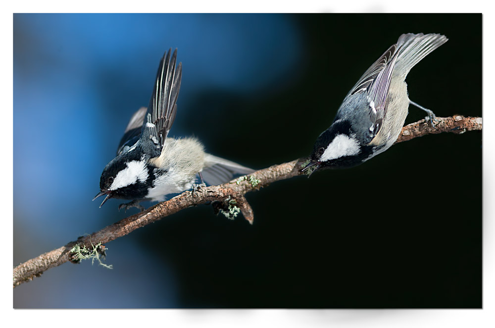 Bellissimo scatto, complimenti per come sei riuscito a congelare l'attimo, peccato solo per la testa dell'uccello di destra che trovandosi con lo sfondo nero s'impasta un pochetto. Purtroppo non potevi fare diversamente.