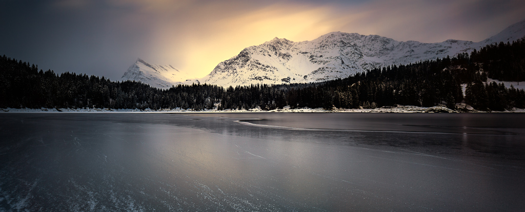 Immagine da gelido inverno con un bel bagliore del sole su una splendida location. Una alternativa al taglio panoramico proterva essere lo sfruttamento della texture delle linee sul ghiaccio come primissimo piano.