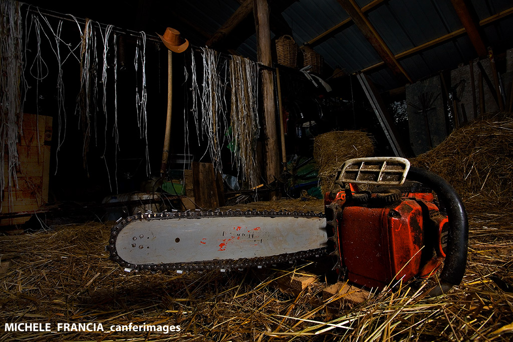 Subito sono partito per fare uno scatto all'aperto in una ceppaia ma mentre cominciavo a piazzare i flash si è messo a piovere e me ne sono tornato indietro, allora ho deciso di rinunciare e di scattare al chiuso nel fienile, anche se non molto coerente con l'oggetto il posto mi è sembrato bello e con degli elementi "rurali" azzeccati che danno un'atmosfera un po'più inquetante.