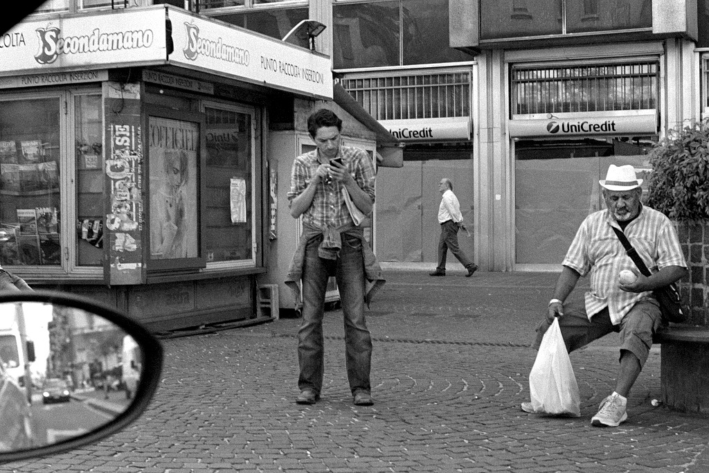 Piuttosto belli i due personaggi, le loro espressioni. Anche quello sullo sfondo, non è male nell' insieme. Penso che il titolo sia troppo importante per una corretta lettura della foto e quindi forse la foto è troppo debole (o davvero poco immediata) da leggersi secondo quell' associazione d' idee certo legata al nostro tempo. E' vero tuttavia che una volta individuata la chiave è uno scatto che apre ad altre sfumature, in particolare per il senso ironico che si può estrarre dalle espressioni dei due. Lo specchietto mi piace parecchio, sia come chiusura a sinistra che come metafora della tua presenza nella scena. Devo dire però che mi appare più in equilibrio su fondo scuro che su quello chiaro.