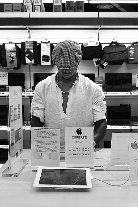 il titolo crea le basi dell'ambientazione dello scatto ma il soggetto principale è, in questo caso, la persona.... fruitrice della nuova tecnologia, nel suo concentrarsi, estraniarsi ed anonimarsi (citando per l'appunto perozzi...) nel mondo i-padiano...