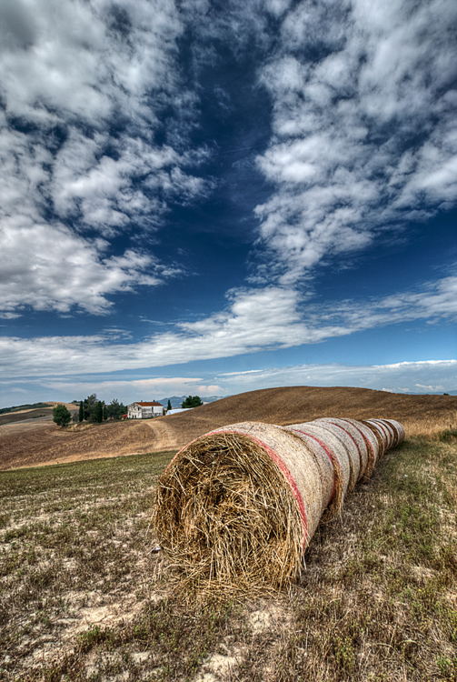 un bello scorcio di un tranquillo paesaggio...elegante e delicata la casa immersa nell'oasi degli alberi..ottima la pdc...mi piace molto anche la linea in primo piano dei covoni....un ottimo lavoro...