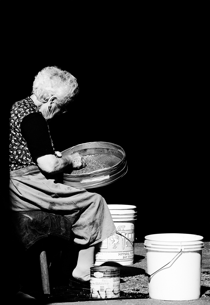 Amp però spostandoti più a destra e abbassandoti avresti avuto la signora più di profilo, per un maggior coinvolgimento di chi guarda - e forse avresti ovviato, tagliandoli, all'ingombro dei secchi bianchi sparati.