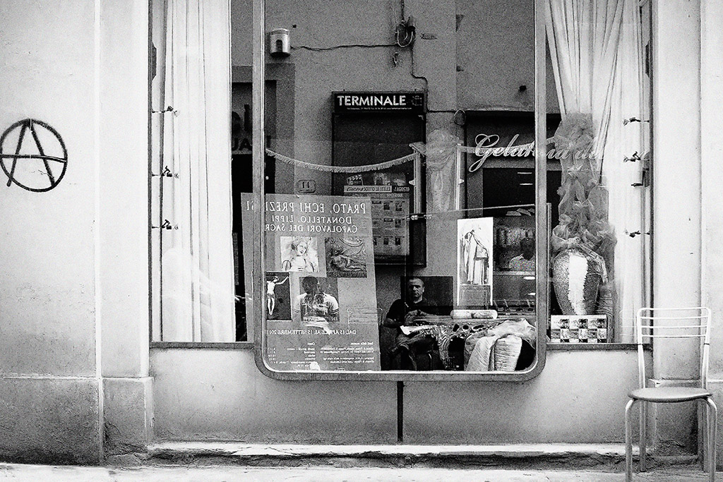 Un riuscito inserimento nei riflessi di una vetrina che, specchiata, diventa finestra.