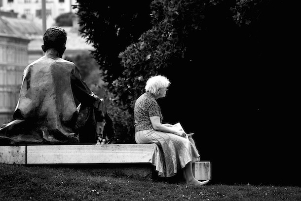 Quello che ho voluto sottolineare in questa foto è la signora che guarda verso il buio, guarda verso un destino già segnato di solitudine in analogia con la statua posta accanto a lei. |