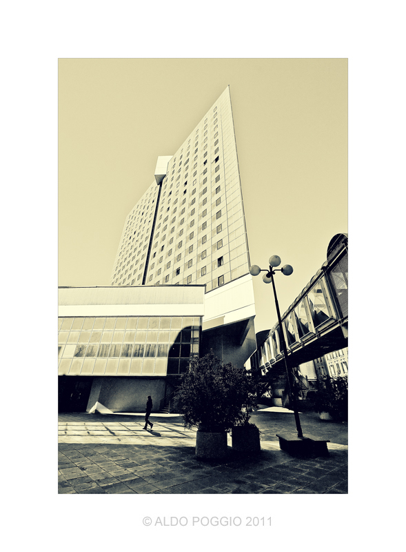 Il punto di ripresa crea linee convergenti che rendono dinamica la composizione,come pure danno l'impressione di leggerezza all'imponente edificio,che assume le fattezze di una vela nel mare urbano.