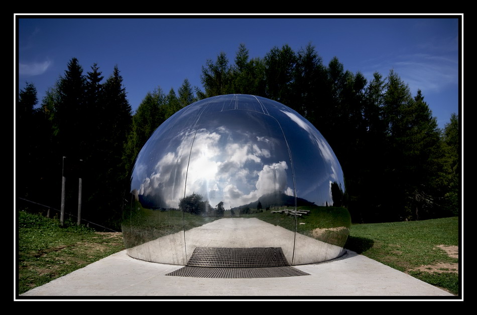 L'oggetto raffigurato, è una cupola di circa quattro metri di diametro in acciaio lucidato progettata per ospitare i delicati strumenti di osservazione astronomica utilizzati per le attività di esplorazione del cielo, scorgerla in mezzo alla natura ha un certo fascino, che ho cercato di trasmettere in questa immagine giocando con le linee e i riflessi, l'unica cosa stonata era il mio riflesso, eliminato in pp.