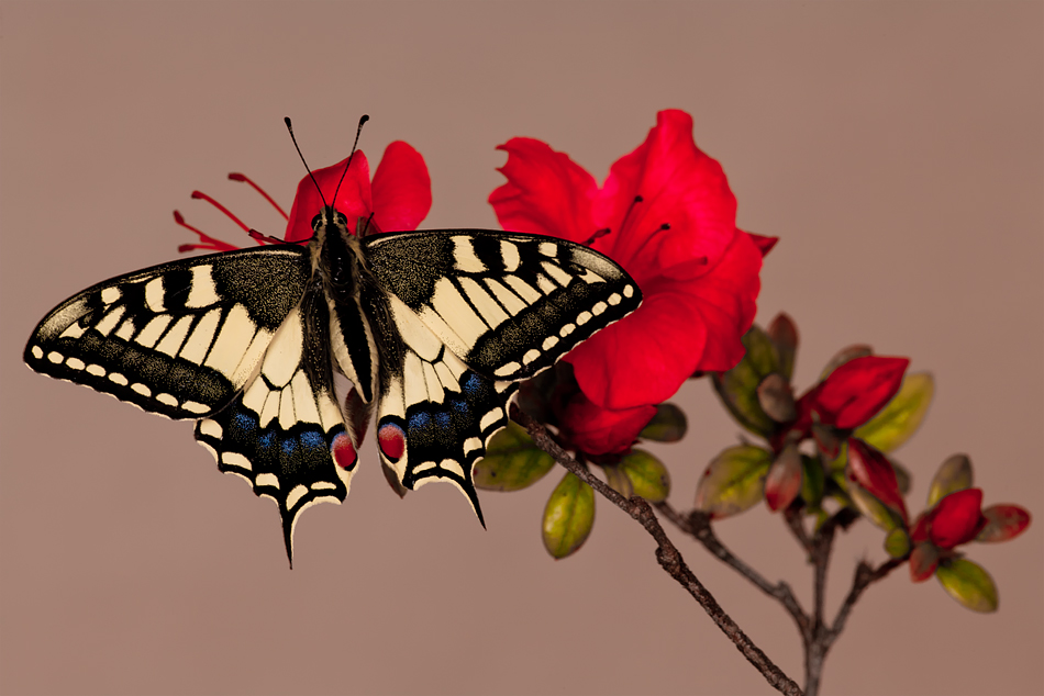 Il macaone collocato in un punto forte del fotogramma cattura la giusta attenzione dell'osservatore.