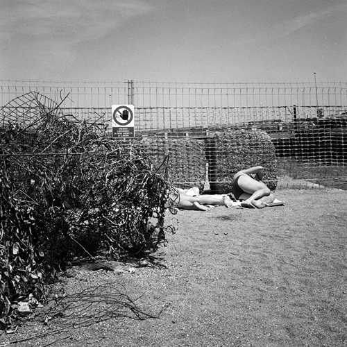 Due letture parziali: un blob di sterpi che sta per inghiottire i bagnanti; un cartello di divieto che ammonisce l'osservatore a non frugare indiscreto i corpi spogliati - che attirano subito l'occhio.