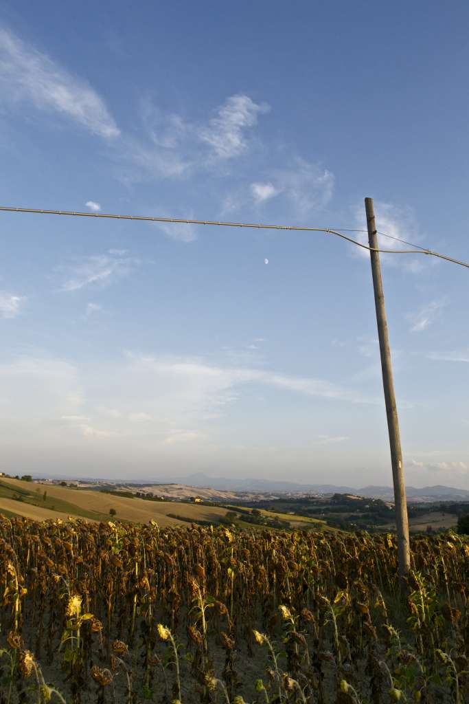 Strana la scelta di includere, quasi come soggetto principale, quel palo pendente, forse anche lui si sta piegando come i girasoli? |