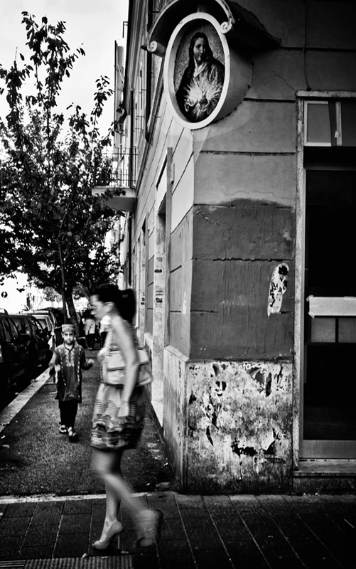 Un Cristo sorridente e protettivo al passaggio di una ragazza vestita estiva, mentre lo sguardo corrucciato del bimbo dal vestito mediorientale ne fulmina la camminata. Anche il titolo mi porta in questo senso, tu come l'avevi vista?