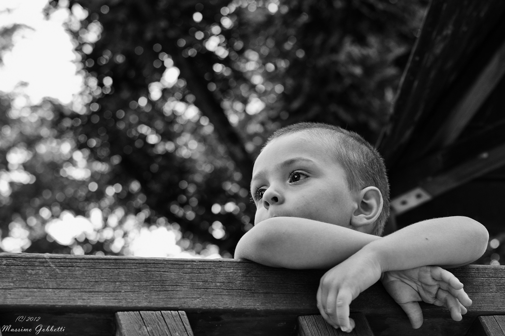 Smile bravo Max, mi piace molto questa composizione con il soggetto molto decentrato. protagonista indiscusso quello sguardo lucido e attento. lui ha un fare quasi "da grande" se si osserva anche la gestualità delle braccia incrociate e adagiate rilassatamente sulla staccionata (?). un bel bn, di carattere Wink
