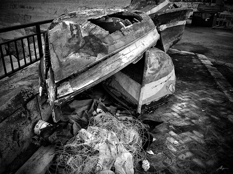 sono contento che la foto ti abbia trasmesso durezza, in effetti ho aumentato di parecchio il contrasto e leggermente la nitidezza proprio a questo scopo, nell'intento cioè di accrescere la drammaticità della scena (drammatica già di suo visto le condizioni di abbandono in cui si trovano le barche).