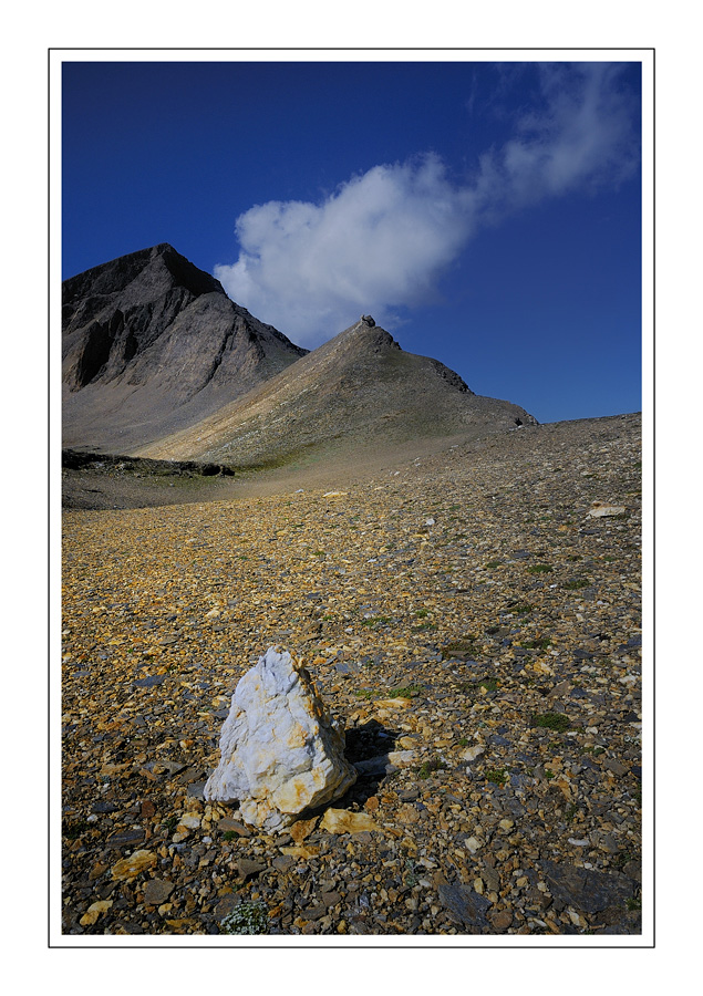 Guardando l'anteprima avrei detto che il masso era un po' troppo scolastico, lì al posto giusto nella composizione. Ma le foto vanno aperte, infatti mi ricredo volentieri ed apprezzo, oltre al richiamo tonale con la nuvola, anche una piacevole continuità con il giallo dei muschi sulla sua superficie oltre che nel pendio.