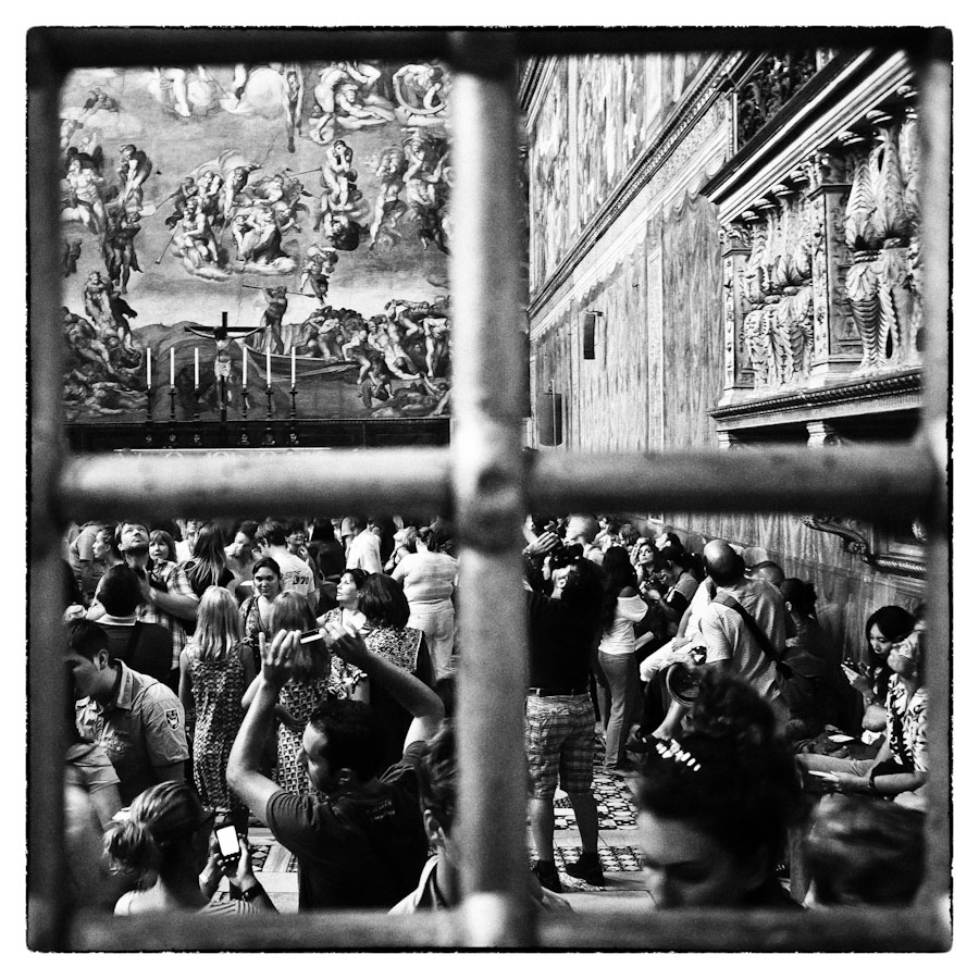 E' vero, la situazione è assai comune, ma a me non sarebbe venuto in mente di fotografare la massa di assatanati che quotidianamente riempe la Cappella Sistina. Belle! Soprattutto la prima che ci fornisce una visione, dietro le sbarre, ancora più estraniante.