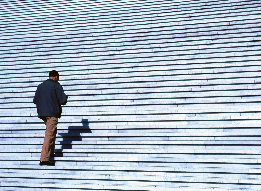 mi da l'idea di una scala musicale e l'uomo che figura come un pentagramma.