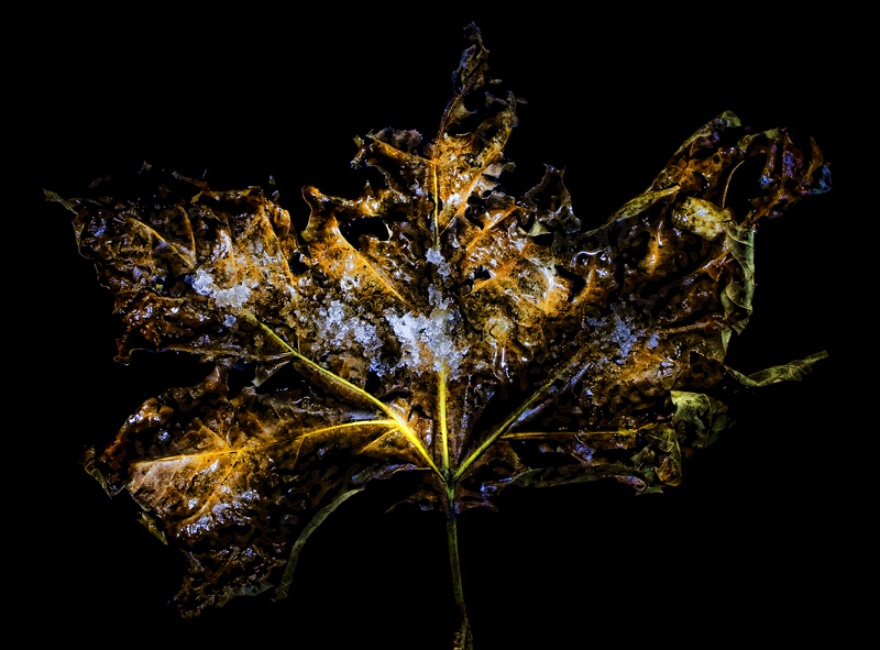 Ho visto delle foglie stupende da un grosso albero che ho sotto casa. Stavo pensando come poter rendere interessante uno scatto da studio con questo soggetto. Parlando con Sisto Perina mi ha suggerito di congelarla. Allora l'ho tenuta nel freezer per 4 ore e poi l'ho piazzata su fondo nero e posizionato la D7000 con 35 mm. 1.8 su cavalletto in modo da poter illuminare con una torcetta a LED in light painting il tutto.