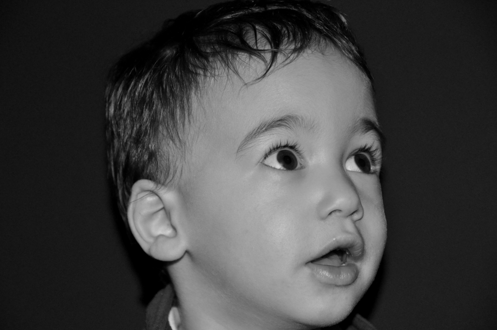 Vedo l'inquadratura un po' troppo centrata e ravvicinata, avrei lasciato meno spazio a sinistra dando nel contempo un po' di aria a tutta l'inquadratura, prendendo, ad esempio, tutto il collo del bambino e completando la forma della testa senza quel leggero taglio che dà più la sensazione di un'indecisione, taglio o non taglio, che di una scelta precisa; la conversione in BN la trovo un po' troppo grigia a monotona, la riproverei aprendo i bianchi, prendi come riferimento gli occhi, e contrastandola un pelino in più.