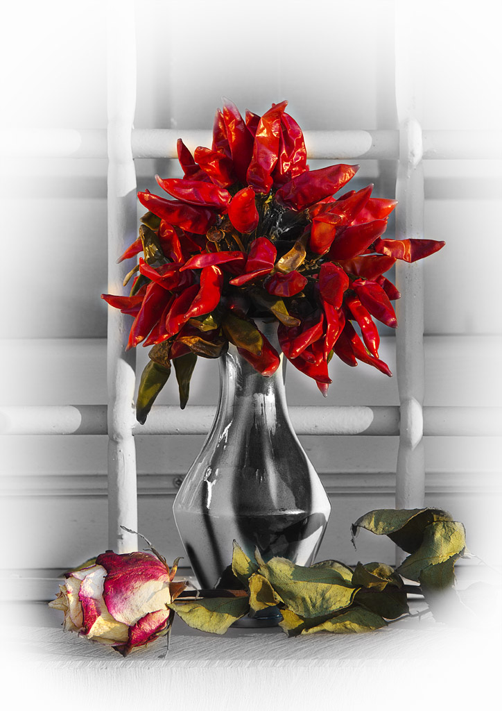 Le sbarre e la finestra sono quelle del terrazzo di casa mia, perché la foto l'ho fatta appoggiando il vaso e la rosa sulla soglia della finestra. C'era un tramonto spettacolare con una luce che rendeva il rosso dei peperoncini ancora più bello e brillante. In più mi piaceva l'idea delle sbarre che creano una specie di cornice sul retro dei peperoncini.