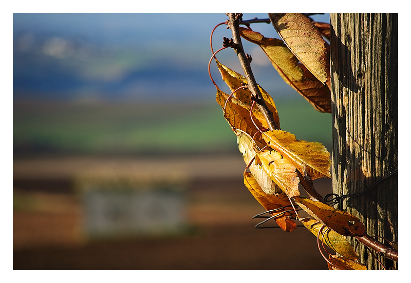 Molto bella, entusiasmante il colore con le fasce verdi-blu-grigioazzurre che fanno risaltare tridimensionalmente le foglie secche del primo piano. Una curiosità: cos'è loggetto bianco sfocato in basso, troppo piccolo per essere una casa (almeno, direi)?