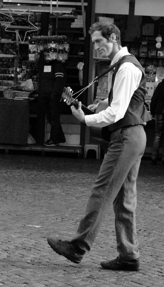 mi sembra incompiuta, nel senso che - suonatore concentrato a parte - mi manca quella relazione col pubblico che resta accennata nello sguardo nascosto del ragazzo sullo sfondo. Forse per la conversione in b/n, è un dettaglio poco leggbile.