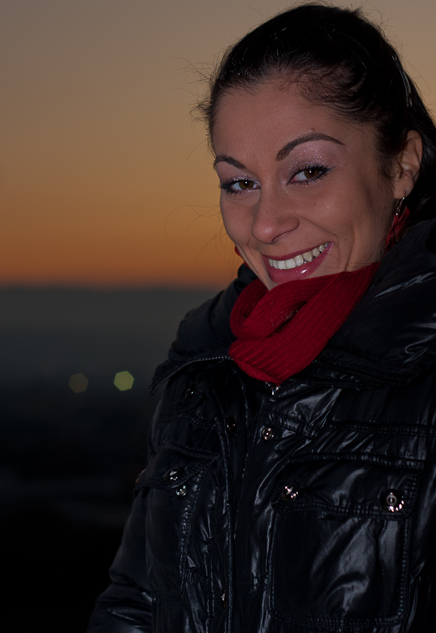 Direi che il flash è troppo evidente e genera una illuminazione sfavorevole e piatta che non valorizza il volto del soggetto e produce un risultato poco accattivante. La testa mi sembra un po' troppo insaccata, soprattutto a causa del mento infilato "dentro" la sciarpa. Il taglio, come già osservato precedentemente, appare troppo sbilanciato, con la testa quasi a contatto con il margine superiore e troppa aria inutile in basso. Anche la distribuzione delle masse risulta poco accorta, con il nero della giacca che corrisponde esattamente con l'area scura dello sfondo e il volto che combacia con quella chiara del cielo. Forse le aree andavano distribuite in modo più movimentato.