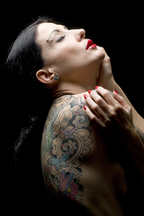 Smile molto ben dosata la luce che investe il viso di questa donna e ne fa emergere la figura dal buio. donano interesse al tutto sia i tatuaggi che i gioielli all'orecchio e al sopracciglio. disturba quello che si intuisce alla narice sn di lei, in quanto non ben visibile. la composizione mi fa desiderare di vedere le braccia comprese dei gomiti.