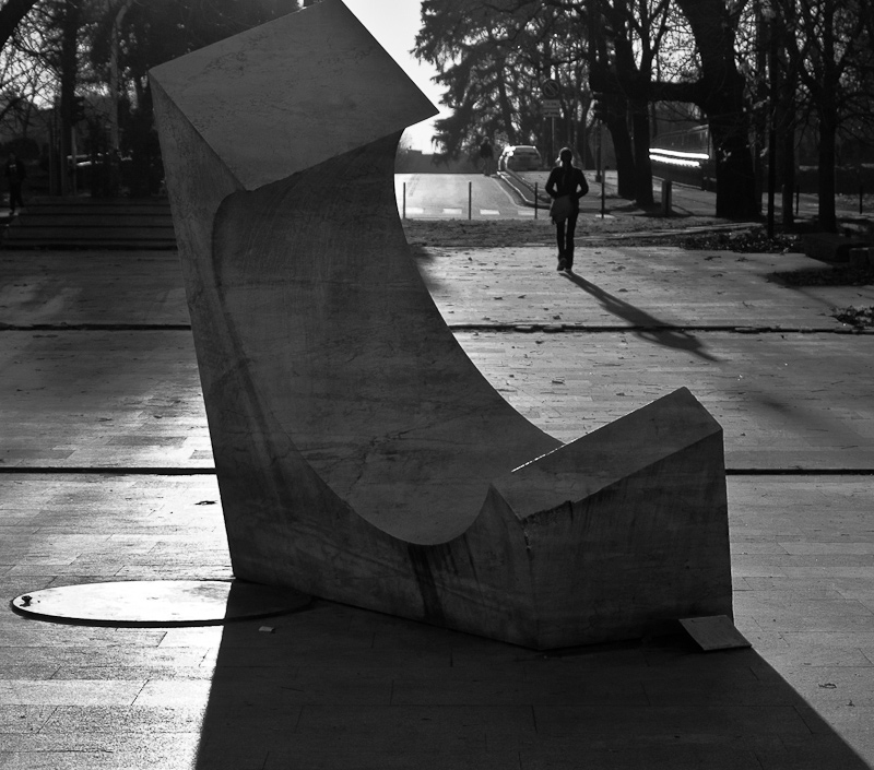 sarebbe stata così un altra foto: in realtà mi interessava la persona, con la sua ombra, l'altra figura in lontananza, le righe orizzontali del terreno; l'arco incavato dell'installazione poteva essere un mirino nel quale farci stare la sagoma umana.