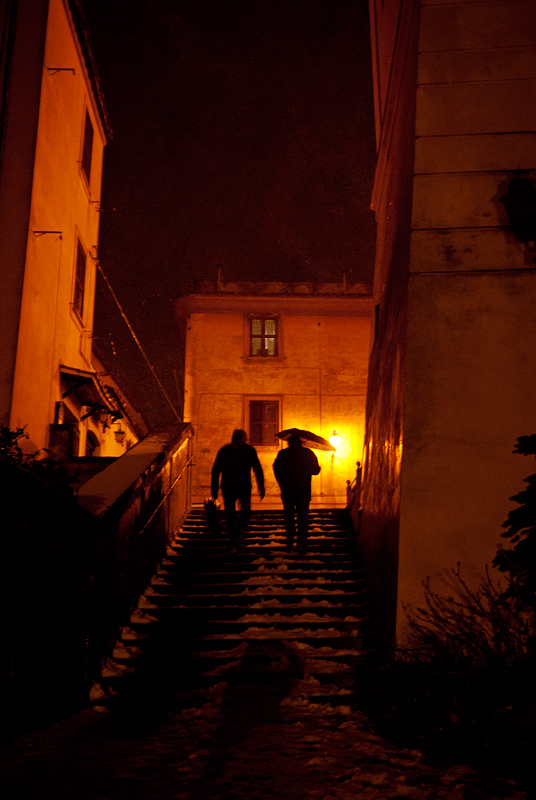 La vedo con un po' d'ironia...divertente sembra che l'ombra dell'uomo con l'ombrello si sia fermato per fare una foto allo scorcio..