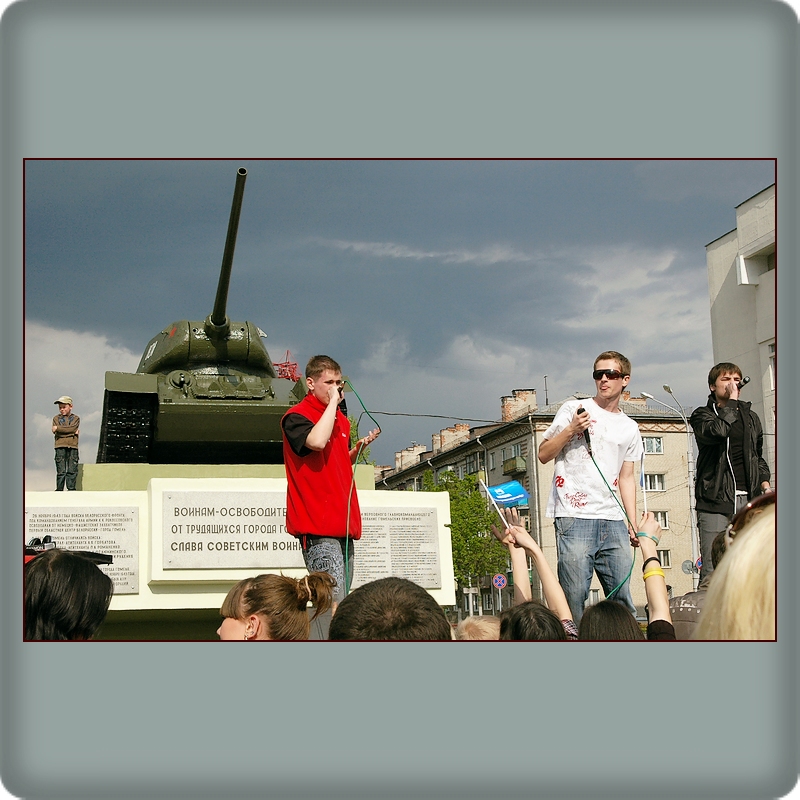 Resta solo il contrasto fra il carro armato trasformato in monumento e lo scalcinato complesso rock che si esibisce sul palco (non è quello della mia amica Masha, però ...).