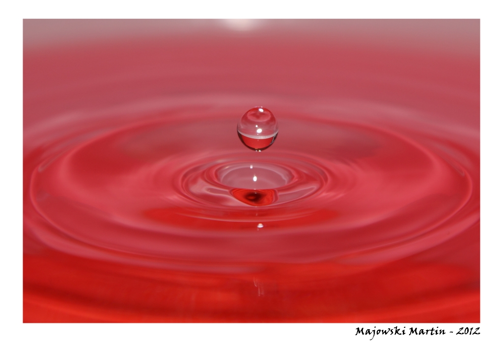 Il colore rosso è dovuto in parte alla baccinella in parte a un cartoncino rosso usato come sfondo. La baccinella in questo caso era rossa con il bordo che sfumava verso il bianco. La riga bianca in mezzo alla goccia infatti è dovuta proprio al bordo.