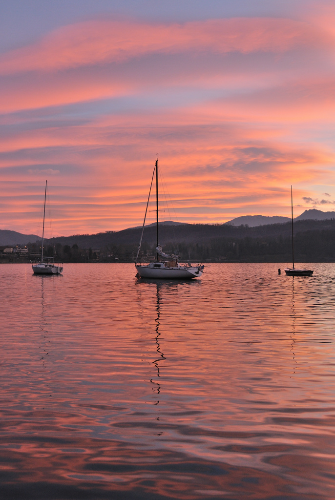 Ho pensato la stessa cosa di domenik82, ma comprendo la tua intenzione di puntare sulle simmetrie: le 2 imbarcazioni ai 2 lati dell'imbarcazione centrale enfatizzano ulteriormente questo aspetto. Davvero molto bella la luce del tramonto, che sa conferire fascino (e romanticismo...) alla scena ripresa