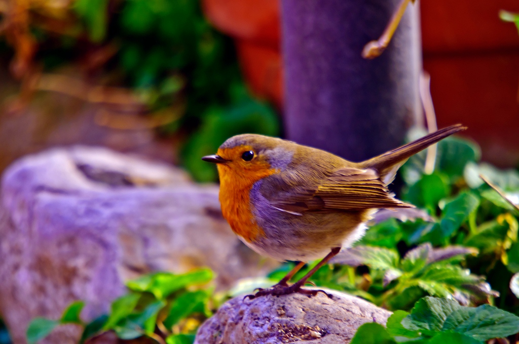 Pettirosso devastato da un eccesso di magenta intollerabile, che è il problema più evidente. Poi certo che il contorno non ne favorisce la godibilità: sassi, foglie, un palo (?), un vaso (?)... un po' troppa confusione, direi. Ma il... mistero rimane questo sbilanciamento del colore così totalmente fuori gamma. In sostanza, scusa la franchezza, ma è a mio parere uno scatto assolutamente sbagliato.