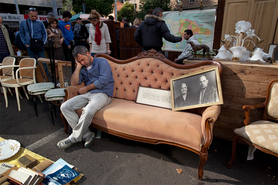 @ Francesco Ercolano è il mercato domenicale di Porta Portese. E' vero che una ripresa frontale avrebbe isolato di più il soggetto ma avrebbe eliminato i clienti che sono parte integrante del mercato.