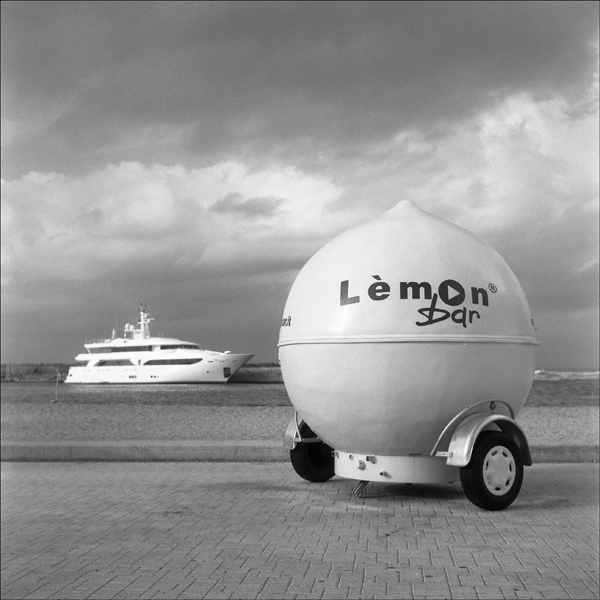 Non si capisce bene se ci proponi questo scatto per mostrarci il sicuramente bizzarro chiosco/bar (se di questo si tratta) o per presentarci un accostamento tra forme così antitetiche, suggerendo quasi che la prua dell'imbarcazione si appresti a forare il fianco dello sferico veicolo. Resto incerto tra queste due letture, sempre consapevole della leggerezza dell'intenzione dello scatto.