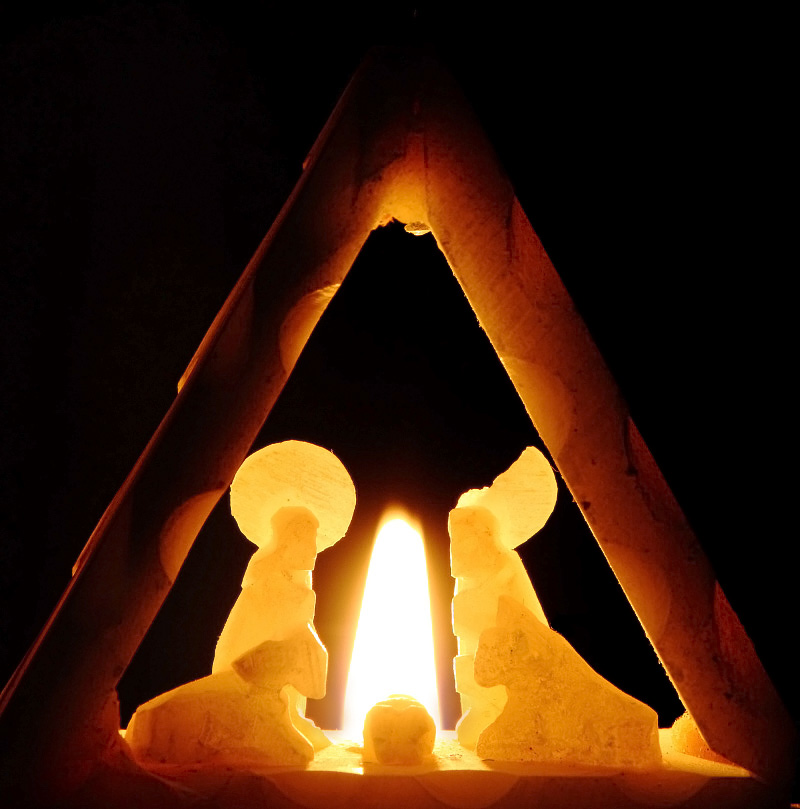 Altro presepe in pietra, dove la luce collocata esternamente sfrutta la trasparenza per illuminare tenuemente la scena della natività. Anche qui la luce in mezzo all’oscurità è tema centrale.