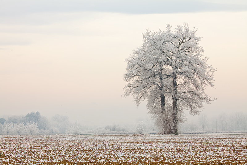 Che belli quei gruppi di alberi che si perdono nella foschia, con la chicca della casetta persa nella pianura.