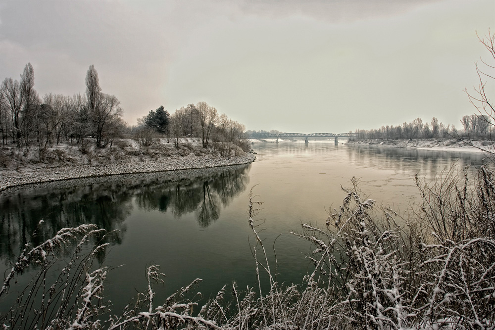 Una buona composizione col pp a far da cornice a questo Po metallico che porta diritto lo sguardo sulle conosciute arcate del ponte di Cremona(non mi sbaglio vero?).