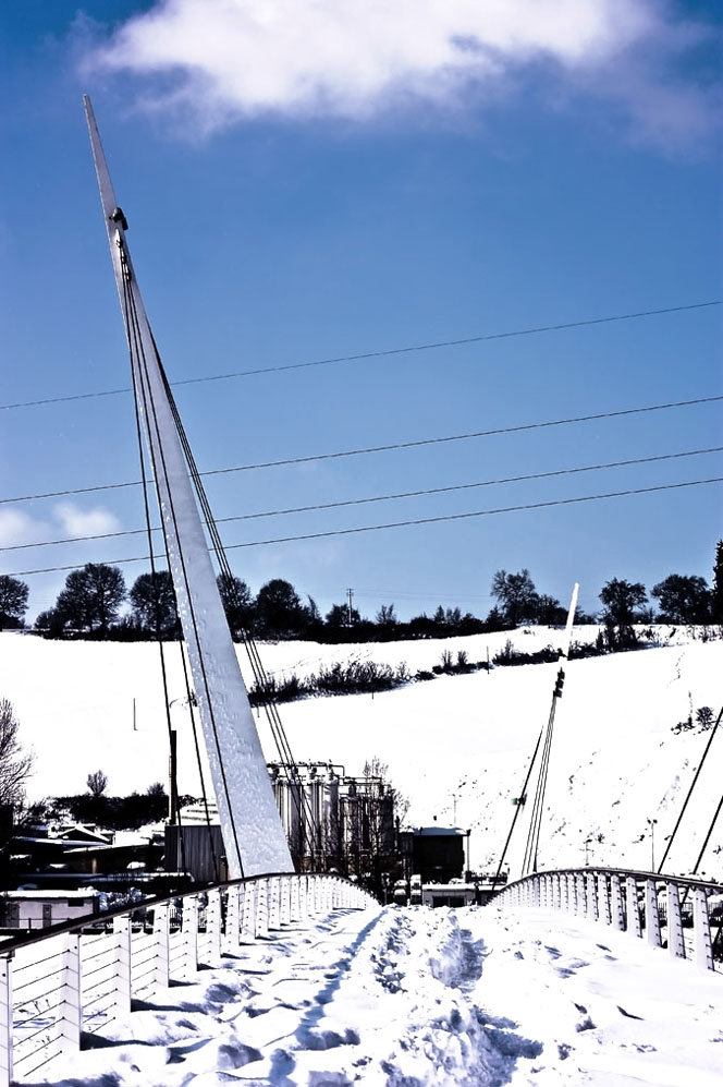 | Dal punto di vista compositivo forse abbassandoti avresti fatto sì che l'elemento verticale si stagliasse più efficacemente contro il cielo. Sai tu se era possibile un altro punto di vista (per esempio opposto a quello che vediamo) che ti permettesse di evitare quei cavi che attraversano il cielo. Sul piano tecnico il contrasto è eccessivo e l'esposizione appare superiore al necessario, tanto da rendere indistinguibile qualsiasi dettaglio del manto nevoso. La neve da questo punto di vista è sicuramente un elemento difficile da fotografare e proprio per questo l'esposizione deve esser molto ben ponderata. Un'occhiata all'istogramma della tua fotocamera probabilmente ti avrebbe mostrato questo problema con un vistoso appiattimento del grafico sulla destra. CIAO!