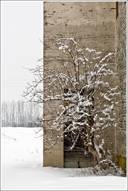 In questa immagine c'è tutto quello che è la pianura con i suo fili a contendersi l'orizzonte, c'è la storia di industriose genti che ancora resiste attaccata ai muri delle cascine che non conoscono più l'essere vissute.