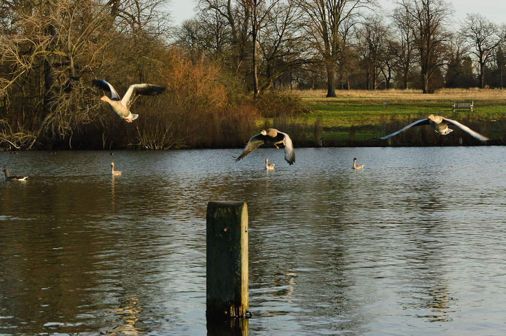 I problema dello scatto è stato la subitaneità del decollo: stavo cercando un'inquadratura per riprendere gli uccelli galleggianti, quando improvvisamente questi tre si sono alzati in volo e ho cercato di cogliere l'attimo. Era una situazione in cui sarebbe servita la raffica e forse la priorità di tempi, ma non ho avuto il tempo di impostare nè una nè l'altra...