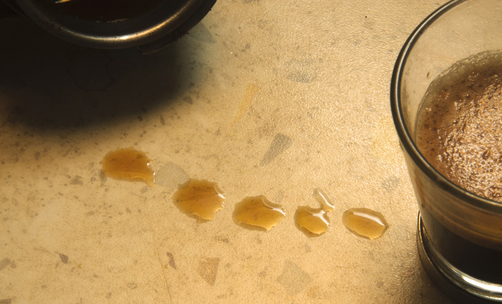 per me le gocce diventano il soggetto principale della foto, perché in realtà non sono gocce, ma tracce. Rappresentano il collegamento tra i due elementi presenti nell'inquadratura quando il caffé é andato verso il bicchiere.