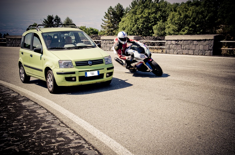 Lo scatto si fa apprezzare proprio per la simpatica contrapposizione tra moto veloce e panda lento (da notare la chicca della lumachina copri targa... )...