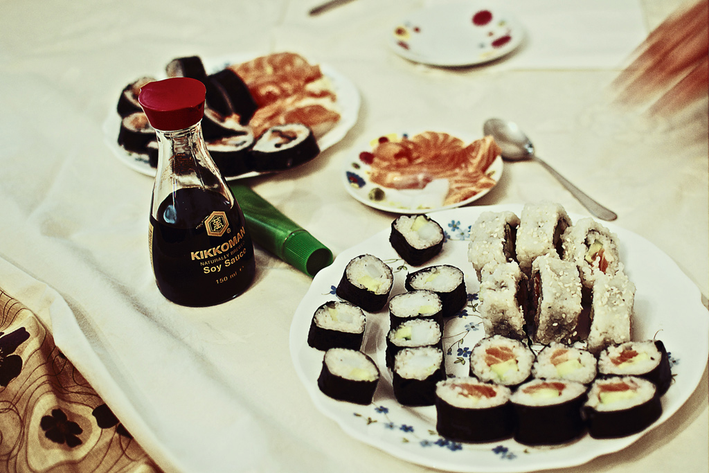Per le foto di food (genere assai difficile) normalmente non si sceglie una chiave così contrastata e dura (neri chiusi e bianchi sparati), dato che l'obiettivo è quello di rendere accattivante il soggetto, e qui non mi sembra che tu riesca molto nello scopo. Il fuoco poteva essere più accurato sul piatto in primo piano (magari tenendo questo un po' più "dentro" il rettangolo). Per quanto riguarda la composizione è realizzata in modo da comprendere qualche elemento di troppo (angolo superiore destro), qualcuno tagliato dal margine, qualche sovrapposizione casuale e complessivamente non conduce lo sguardo sul sushi. Il problema principale infatti è che tutta l'attenzione cade sulla boccetta di salsa di soia (e il brutto tubetto verde), occupando questo una posizione forte e distinguendosi per intensità cromatica e volume. E se questo invece è "il soggetto" come il titolo suggerisce ha troppo poco spazio. Insomma: secondo me complessivamente non una foto particolarmente riuscita. Ma se ti piace la cucina giapponese puoi sempre ritentare