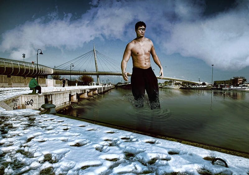 Alex, l'idea è validissima, ma vedo gli schizzi d'acqua in prossimità delle ginocchia, davvero poco realistici, idem per il movimento d'acqua, sempre in quella zona
