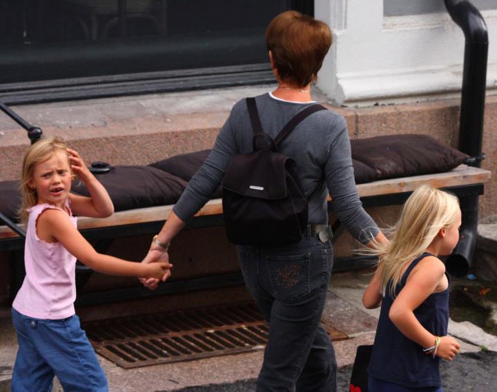 Mi sembra che qui sia stao colto un quadretto di vita molto descrittivo dei paesi del grande Nord: le bimbe, bellissime e biondissime, la madre (sempre che sia la madre) che sembra non preoccuparsi molto se una delle due fa i capricci, la tira avanti con un gesto insieme affettuoso e deciso, mentre blocca l'esuberanza dell'altra che sembra intenzionata ad andare per i fatti propri.