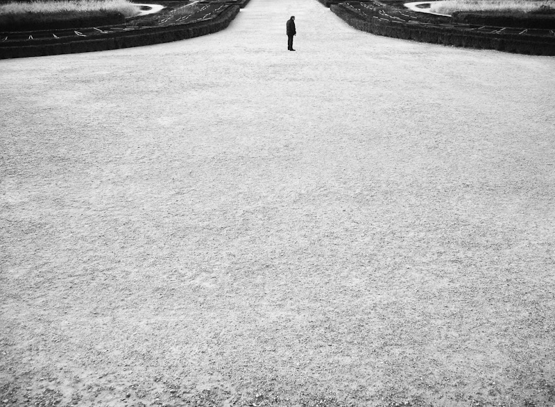 come fa ad essere simmetrica pure essendo cosi sbilanciata nella composizione degli spazi ? perché lo spazio abbondante nella parte bassa dell'inquadratura sottolinea la finitezza della figura umana, con la schiena curva, quasi come se sapesse e mantenesse il peso della visione. Fortuna che le siepi ai lati si aprono prendendo la forma di ali.
